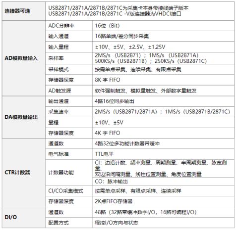 USB2871(A/B/C)系列采集卡是本公司推出的一款多功能數(shù)據(jù)采集卡。該系列板卡最高提供16路單端或差分模擬量輸入,16bit分辨率,靈活的通道轉(zhuǎn)換量程,同時(shí)用戶可通過(guò)多卡級(jí)連的方式擴(kuò)展通道數(shù)量;提供4路或2路模擬量同步輸出,16bit分辨率;支持32路或8路帶緩沖數(shù)字IO,以及16路可編程IO:并且提供了4通道多功能計(jì)數(shù)器,滿足用戶的多樣化需求。